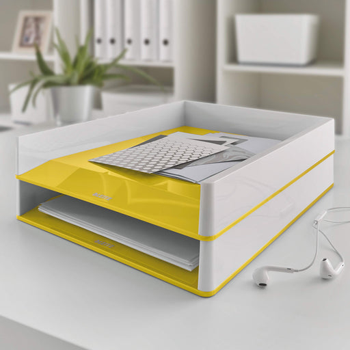 View full detailsDual colour Letter tray in white and yellow with a glossy finish, Contemporary design, For the organisation of A4 and US size documents at your of...