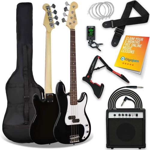 • Shaped in an iconic designed P-Style, this Bass Guitar is versatile enough for any genre of music. It is supplied in a high-gloss black finish with a PVC white scratch plate and covered pickups to give a sleek and modern aesthetic.Included is a 15-watt amplifier which is ideal for bedroom practice but will also allow you to get good volume for when you want to be heard. This amplifier also has a headphone socket for silent rehearsals - ideal for night practice or houses with thin walls! Some essential accessories are also included; a gig bag allows easy transport and storage, a cable to make sure you can plug in straight away and get playing, along with a guitar strap, digital tuner, spare strings and a guitar stand.