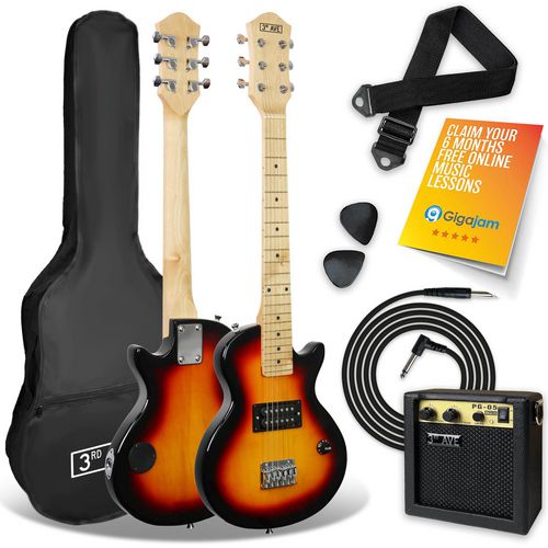 • The Junior Electric Guitar pack from 3rd Avenue is perfect for young learners looking to start playing the electric guitar. Due to the small size of this instrument, it is suitable for those aged around 5-8 years old. The guitar accessories included with the pack will get you playing straight away. Designed in the iconic LP style, this electric guitar features the same scale and materials as a full-sized electric guitar with a compact body, giving children the opportunity to learn to play from a younger age. Featuring 1x Humbucker pickup you get a thicker sound associated with Rock & Roll alongside volume control and a fixed bridge for stable tuning. Included in this pack is a gigbag which allows for easy transportation or storage of your guitar. A guitar strap allows for comfortable playing while standing and the guitar picks mean that you can play with ease. Included is a battery-powered amplifier that allows you to play with some good volume whether you€™re at home, lessons or anywhere else, the amp has volume and tone controls as well as the option for a clean or overdrive sound. A standard jack to jack cable is included which connects your guitar to the amp.