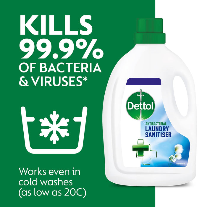 • Ideal for Towels, children's clothes, underwear, socks, bedding ...and more How to Use To kill 99.9% bacteria and give odour free freshness: Add 2 capfuls to the fabric softener drawer of your washing machine Soaking: add 1 cap to 2.5L of water at 20ºC for 10 minutesSafety WarningDanger. Causes serious eye damage. Harmful to aquatic life with long lasting effects. If medical advice is needed, have your Dettol product container or label at hand. Keep out of reach of children. If in eyes: rinse cautiously with water for several minutes. Remove contact lenses, if present and easy to do. Continue rinsing, immediately call a poison centre or doctor/physician.Box Contains1 x Dettol Antibacterial Laundry Cleanser 2.5L - Cotton Fresh