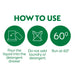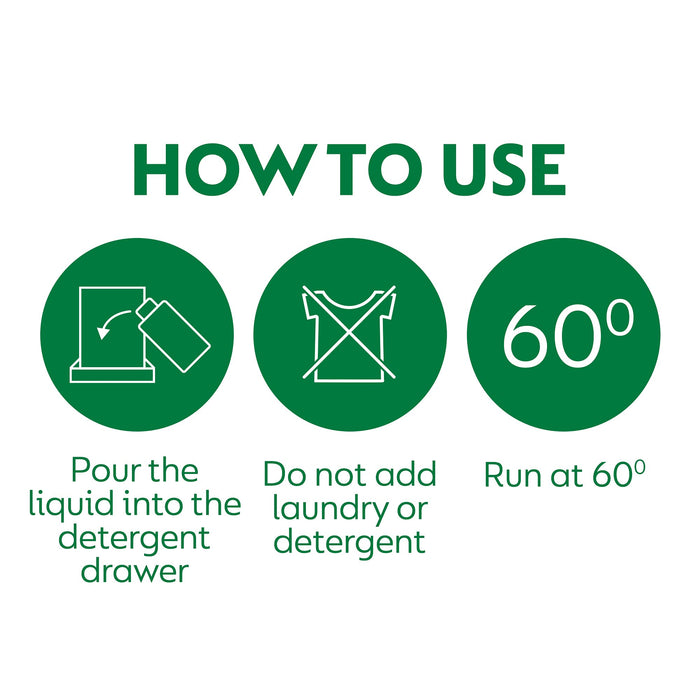 • Use on an empty machine, every 2 months. Recommended dosage 250ml. Pour the liquid into the detergent drawer - do not add detergent. Run the washing machine at 60°C without any laundry
