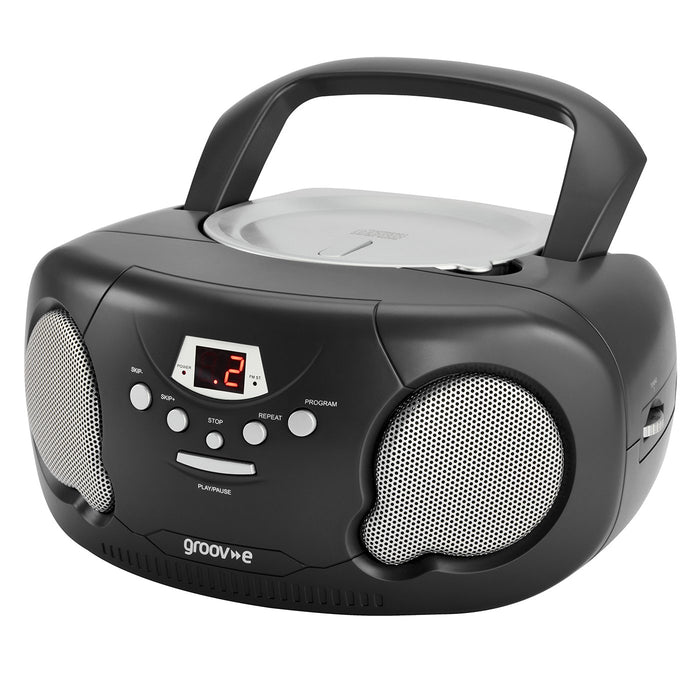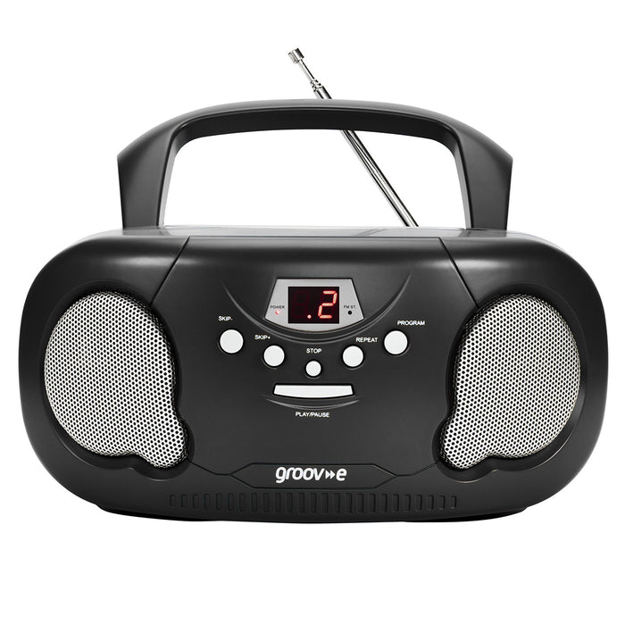 - This Groove-e Boombox CD and Cassette player is CD/CD-RW compatible and has a 20 track program function. It also features a LED display and a 6-keys cassette player as well as an AM/FM radio. You can connect your headphones via 3.5mm aux-in socket and 3.5mm headphone socket. The carry handle makes transportation easy and the AC power cord is included. It can also be battery powered.