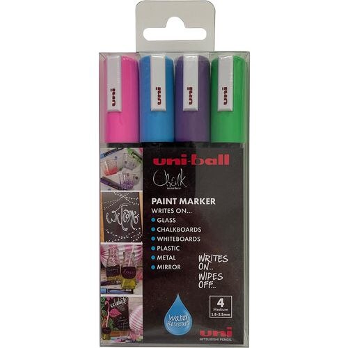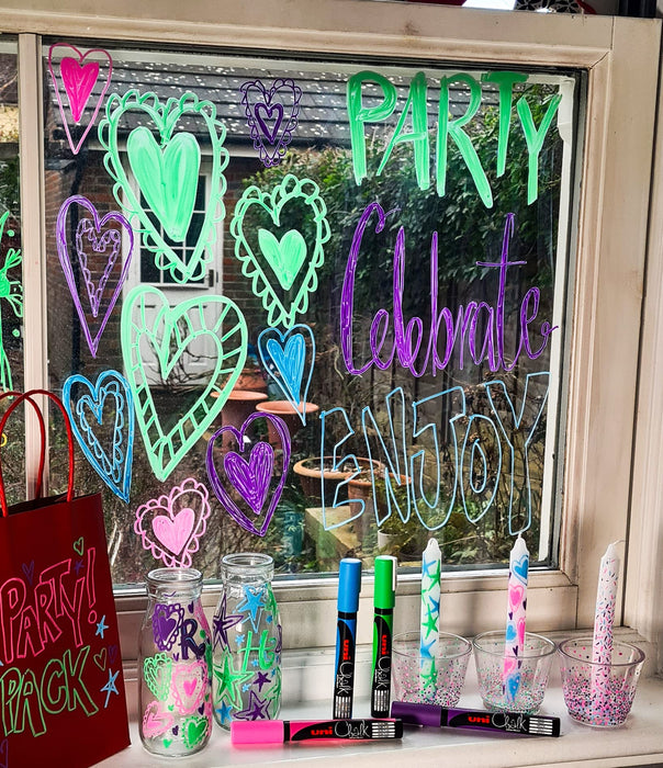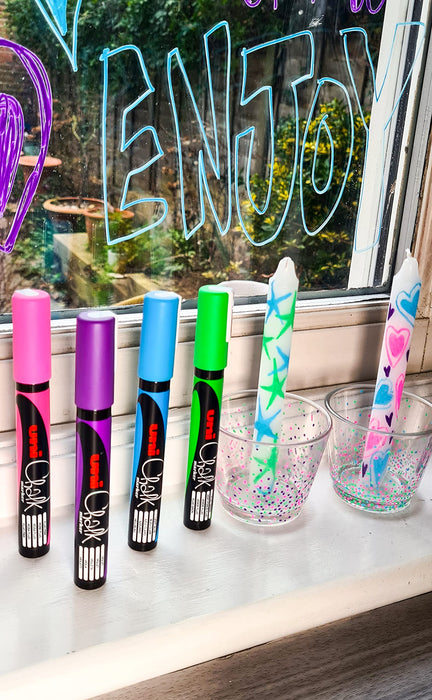 • Ain€™t no party like a uni-Chalk Marker party so grab this colourful pack and get your celebration on! This colourful party pack contains four PWE-5M uni-Chalk Markers in green, pink, violet and blue - perfect for a colourful gathering. The 1.8 €“ 2.5mm bullet tip makes this pen a great all-rounder, good for hand lettering and bold, robust drawings.
