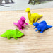 - About this item Novelty rubbers in the shape of four brightly coloured dinosaurs including T-Rex, Brontosaurus, Spineosaurus and Ceratops Set of 4 solid dinosaur erasers in a clear plastic zipped bag Each eraser is approximately 4cm size, bag is 7.5cm x 7.5cm There are four erasers per pack including a green T-Rex, pink Ceratops, yellow Spineosaurus and a blue Brontosaurus (or thats what our dinosaur experts say they are)