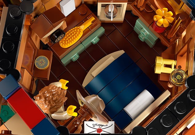 • Main bedroom cabin features a buildable bed, and assorted elements including hidden scissors (as a reference to the fan creator’s day job as a hairdresser), ship in a bottle, compass, clock plus a balcony with a hand-operated, wind-up crane to lift items up to the cabin.