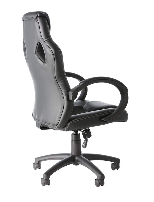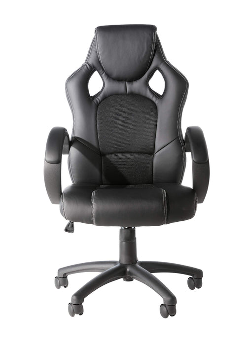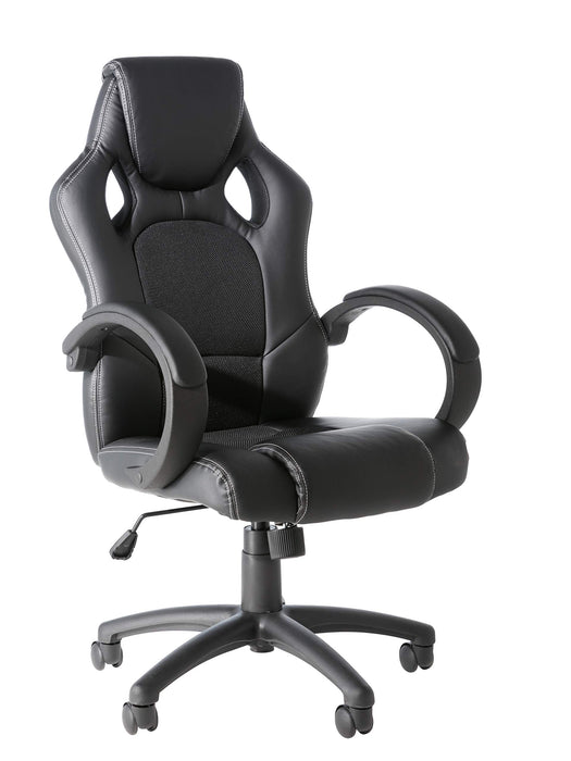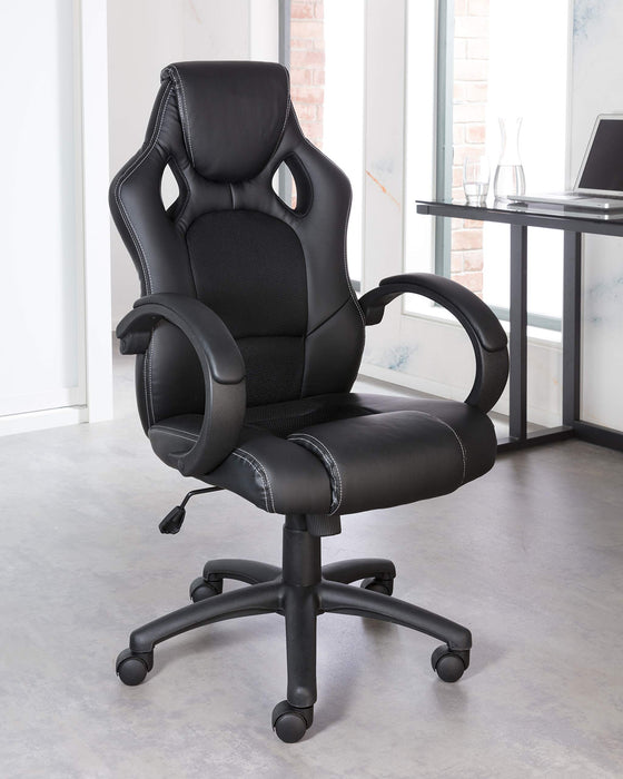 - Faux leather racing style chair with fabric inserts