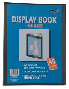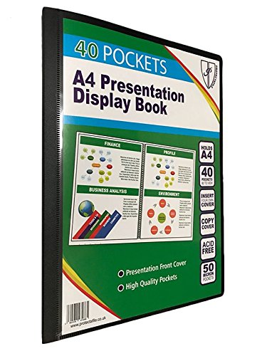 A4 40 Pockets/80 Views Presentation Display Book. Black Only. Front presentation cover. Copy Safe. Acid Free. 600 micron cover. 50 micron glass clear pockets. Individual poly sleeve.