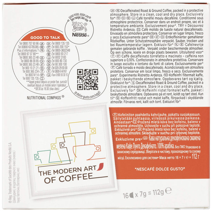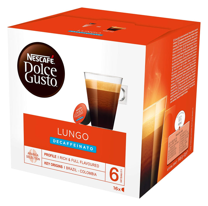 Nescaf Dolce Gusto Caff Lungo Decaffeinato, 16 Capsules: A stylish cup of full-bodied coffee with a rich aroma and a velvety crema layer. Literally a 'long coffee', Caff Lungo Decaff is a 'stretched' espresso without all the caffeine. Instead of making a shot, enough hot water to fill a regular coffee cup (but not a mug) is passed through the roast and ground coffee. The result: a rich and smooth coffee that you can take your time over. , Ingredients:Nescaf Dolce Gusto Caff Lungo Decaffeinato, 16 Capsules: Decaffeinated roasted ground coffee , Pack contains:3 x 1 pack Dolce Gusto Caff Lungo Decaffeinato with 16 capsules for 16 servings Net weight: 112g / pack, 7g / capsule