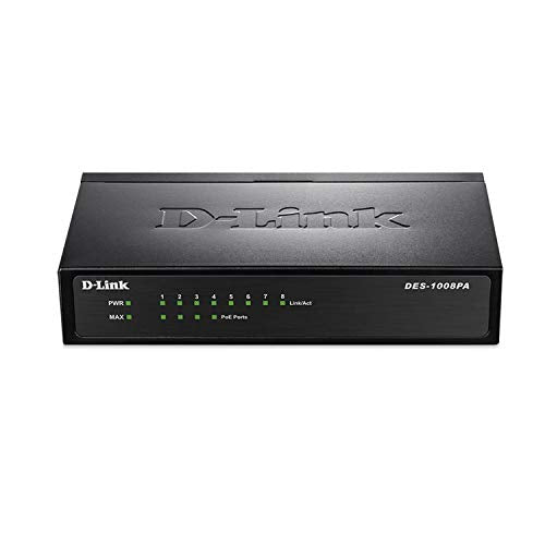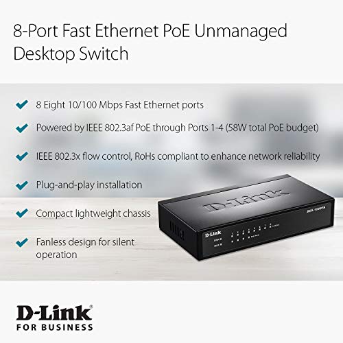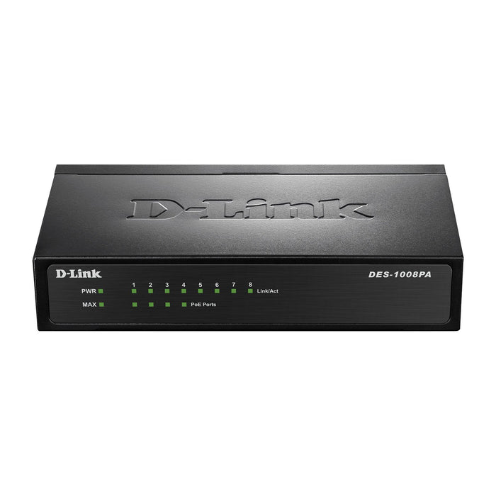 The DES-1008PA 8-Port Fast Ethernet PoE Desktop Switch enables both home and office users to easily connect and supply power to Power over Ethernet (PoE) devices such as wireless Access Points (APs), IP cameras, and IP phones while adding more Ethernet devices like computers, printers, and Network Attached Storage (NAS) onto a network. Built with home and small business users in mind, this compact PoE switch operates silently, making it ideal for use in virtually any room or office. The DES-1008PA features 4 10/100BASE-TX ports that support the IEEE 802.3af PoE protocol. Each of the 4 PoE ports can supply up to 15.4 Watts, a total PoE budget of 52 Watts, allowing users to attach an IEEE 802.3af compliant device to the DES-1008PA without requiring additional power. PoE is especially suitable for devices that are far from power outlets or when you want to minimise the clutter of extra cables. No configuration is required and installation is quick and easy. Support for Auto-MDI/MDI-X on all ports eliminates the need for crossover cables when connecting to another switch or hub. Auto-Negotiation on each port senses the link speed of a network device (either 10 or 100 Mbps) and intelligently adjusts for compatibility and optimal performance. The switch has been designed without fans so you can be sure of silent operation wherever it is installed.Main Features4 x Fast Ethernet Ports4 x PoE Ethernet Ports1K MAC Address TableLegal DisclaimerProduct is sourced and shipped from the European Economic Area (EEA). Product is genuine original from manufacturer authorized distributors.