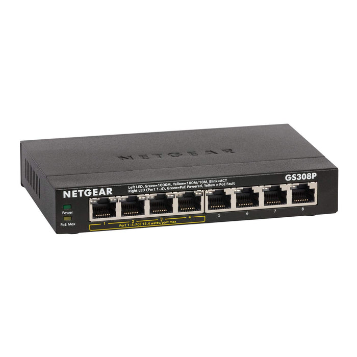 The NETGEAR GS308P Unmanaged Power over Ethernet (PoE) Desktop Switch features 8-Port Gigabit Ethernet, 4 PoE ports with a 55 watt budget, sturdy metal fanless housing and more.Box Contains1 x NETGEAR SOHO Gigabit Ethernet Switch GS308P - Switch - unmanaged - 4 x 10/100/1000 (PoE) + 4 x 10/100/1000 - desktop, wall-mountable - PoE