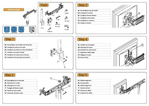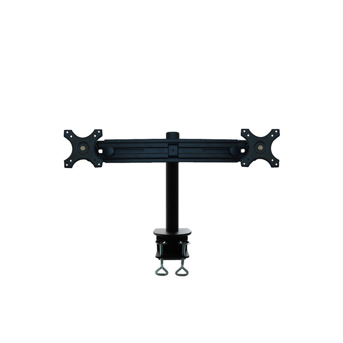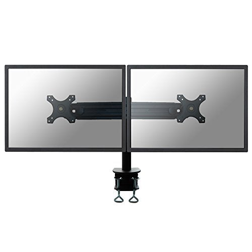 The NewStar desk mount, model FPMA-D700D is a tilt-, swivel and rotatable desk mount for 2 flat screens up to 30?. This mount is a great choice for space saving placement on desks using a desk clamp.NewStar's versatile tilt (180°), rotate (360°) and swivel (180°) technology allows the mount to change to any viewing angle to fully benefit from the capabilities of the flat screen. The mount is manually height adjustable from 32 to 42 centimetres. Depth 15 centimetres. An innovative cable management conceals and routes cables from mount to flat screen. Hide your cables to keep the workplace nice and tidy.NewStar FPMA-D700D has two pivot points and is suitable for screens up to 30" (76 cm). The weight capacity of this product is 8 kg each screen. The desk mount is suitable for screens that meet VESA hole pattern 75x75 or 100x100mm. Different hole patterns can be covered using NewStar VESA adapter plates.By using an ergonomic mount neck- and back complaints can be avoided. Ideal for use in offices and on counters or in a reception area.All installation material is included with the product.What is VESA all about?So you may have heard the term ?VESA? here and elsewhere and perhaps you?re wondering what it means? In simple terms, it?s the 4 holes on the back of most screens that the screen manufacturers and mount manufacturers have agreed between themselves as standard sizes. For obvious reasons, the holes on the smaller screens are closer together (ie 75x75mm), and the larger screens are further apart (ie 600x400mm).So if you don?t know what VESA you have, just measure the distance in between the pre drilled 4 holes on the back of your screen. Typically up to about 55? screen sizes, the hole pattern tend to be square - ie 75x75mm, 100x100mm, 200x200mm, etc.IMPORTANT note: MOST screens have VESA holes but very rarely there are some models that don?t come with them (tend to be the cheaper models across some brands). For these situations, refer to Newstar product code FPMA-VESANON as an adaptor to convert these models to VESA 75x75 and 100x100mm.That?s it, you now know most of what you need to know about VESA. An interesting conversation down the pub perhaps? Perhaps not?..!Newstar have over 20 years experience providing high quality mounts to suit a wide variety of needs. Over our long history we have developed a vast range of mounting solutions, which include the mounting of screens, tablets, projectors, laptops and desktops. One thing that does remain the same across our range is our insistence on high specification materials to ensure optimum reliability for your mounting needs, backed up by the no quibble 5 year warranty.As the old saying goes, "You get what you pay for".Box ContainsNewstar Flatscreen/Monitor Desk Mount (clamp) for dual screen 19-30" (1 pivot) Height Adjustable - Black