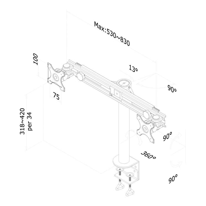 - Tilt, Turn (left and right) and Rotate dual desk mount suitable for two screens between 19" and 30" (check VESA compatability) and up to 16kg max combined weight. Height Adjustable.