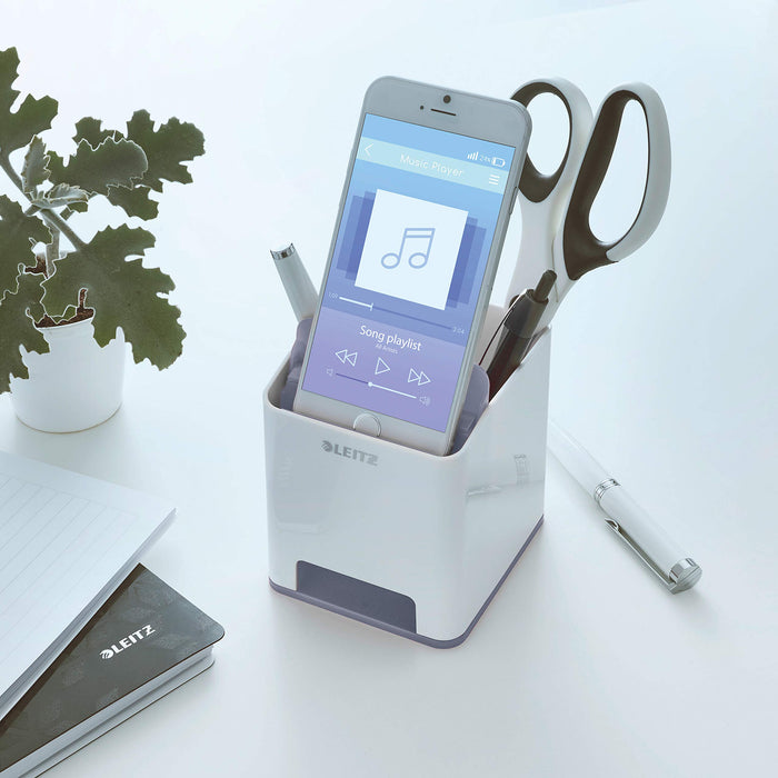 The eye-catching, premium quality Leitz Pen Holder comes in striking and stylish metallic dual colours with a high-gloss finish. This pen holder with sound boosting function perfectly complements other products from the Leitz WOW range. It has a modern and contemporary design that will look great at home and in the office.